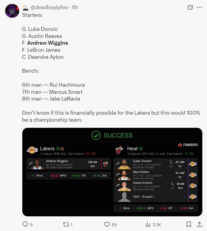 另外,我认为湖人队也不愿意为了交易得到维金斯而付出2031年/2032年的首轮签,除非湖人愿意送出首轮签,不然就算湖人对维金斯有意也没有任何实际意义。