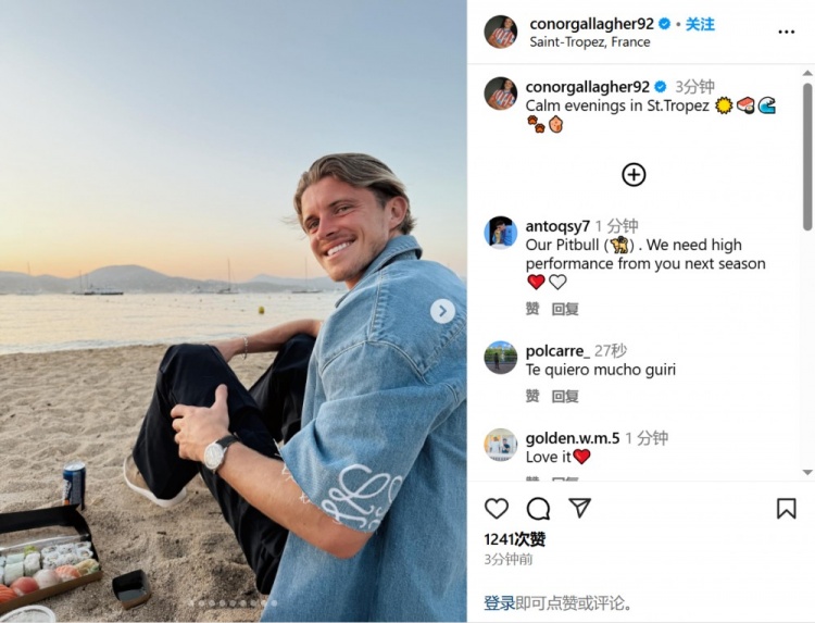 马竞中场加拉格尔在社交媒体上晒出了度假照,定位在法国的圣特罗佩,他还配文写道:“圣特罗佩的宁静夜晚☀️🍣🌊🐾🐚”。